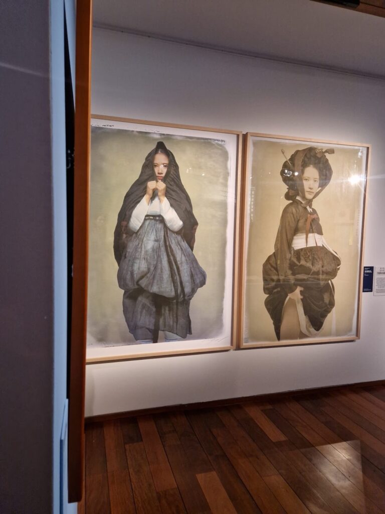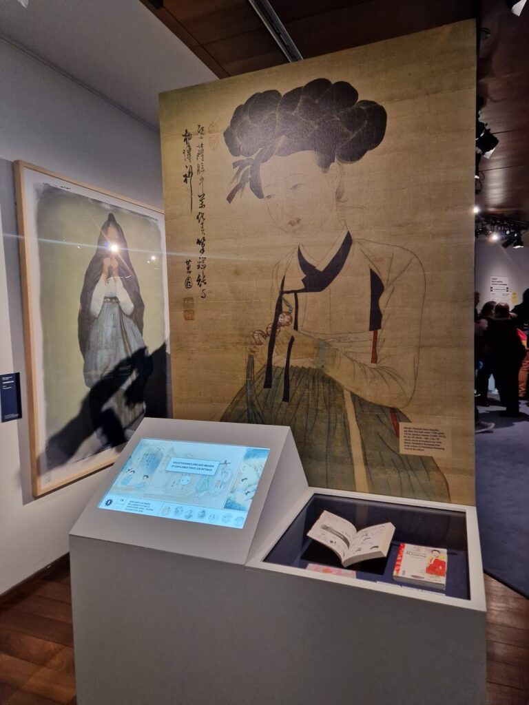 La première salle raconte la fin de l’ère Joseon. Les femmes de cette époque sortaient souvent le visage couvert, un mystère qui a largement nourri l’imaginaire des artistes, tant dans les peintures que dans les manhwas. Vous pourrez y voir des tenues traditionnelles, des hanboks masculins et féminins ainsi que l’oeuvre de Shin Yun-bok, Miindo (미인도) qui signifie “portrait de beauté”, et emblématique. Il peint une courtisane :